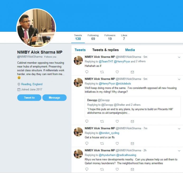 It has the username @NIMBYAlokSharmaMP, standing for Not In My Backyard, and regularly responds to messages about housing by saying there are enough developments.